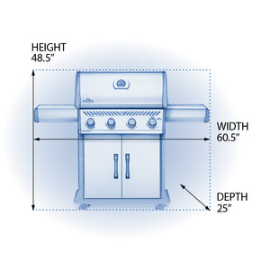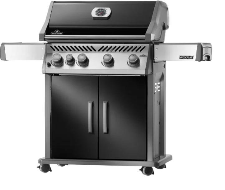 Napoleon’s Rogue® 525 Propane Gas Grill in two-tone black and stainless steel design is a large, premium quality grill with an affordable price. Four burners light instantly with a battery-free ignition. Featuring precise temperature control, high heat searing capability, cast-iron cooking grids, and a side burner, this stylish grill is highly durable and easy to clean. A reversible cast iron griddle and premium protective cover come included with the grill.