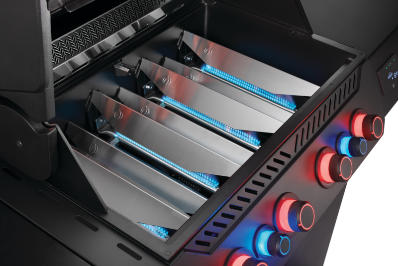 The stunning, matte black, Phantom Prestige 500 Connected, Propane Gas Grill with Infrared Side and Rear Burner is a dynamic evolution in grilling, featuring Wi-Fi and Bluetooth that brings you closer to your grilling experience than ever before. Cast stainless steel cooking grids are virtually maintenance-free and produce exceptional sear marks. Monitor temperatures, set timers, get cook assistance, and receive high-temperature warnings—all from your smartphone. With included temperature probes and an integrated LCD display, you'll always know exactly what's happening inside your grill. A larger rotisserie burner and infrared sear station provide enhanced performance. LED Control Knobs illuminate for nighttime entertaining and feature SafetyGlow™, glowing red for added safety when the gas is on. The stow-away warming rack and hidden tool hooks provide extra prep space. Experience connected living and unique cooking methods with the compelling Prestige 500 Connected Gas Grill.