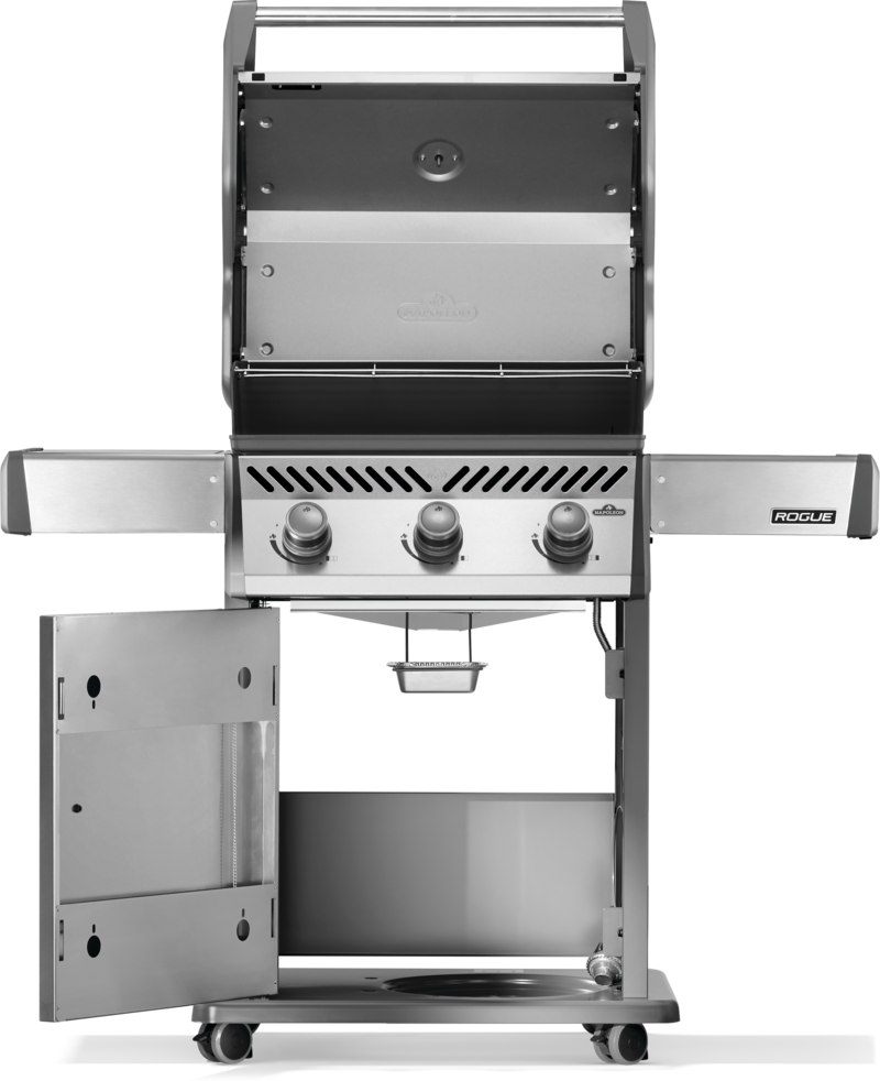 Napoleon’s Rogue® 425 Propane Gas Grill is a premium, yet affordable BBQ marvel. With three burners that light instantly and effortless temperature control, it ensures perfect grilling or roasting. Its cast iron cooking grids deliver even heating and exquisite sear marks, while stainless steel sear plates help reduce flareups. Durable and stylish stainless steel surfaces resist weather and wear. Foldable side shelves enhance storage versatility. Ignite instantly with battery-free ignition. Move effortlessly with Locking Caster Wheels. Enjoy exceptional grilling in any space.